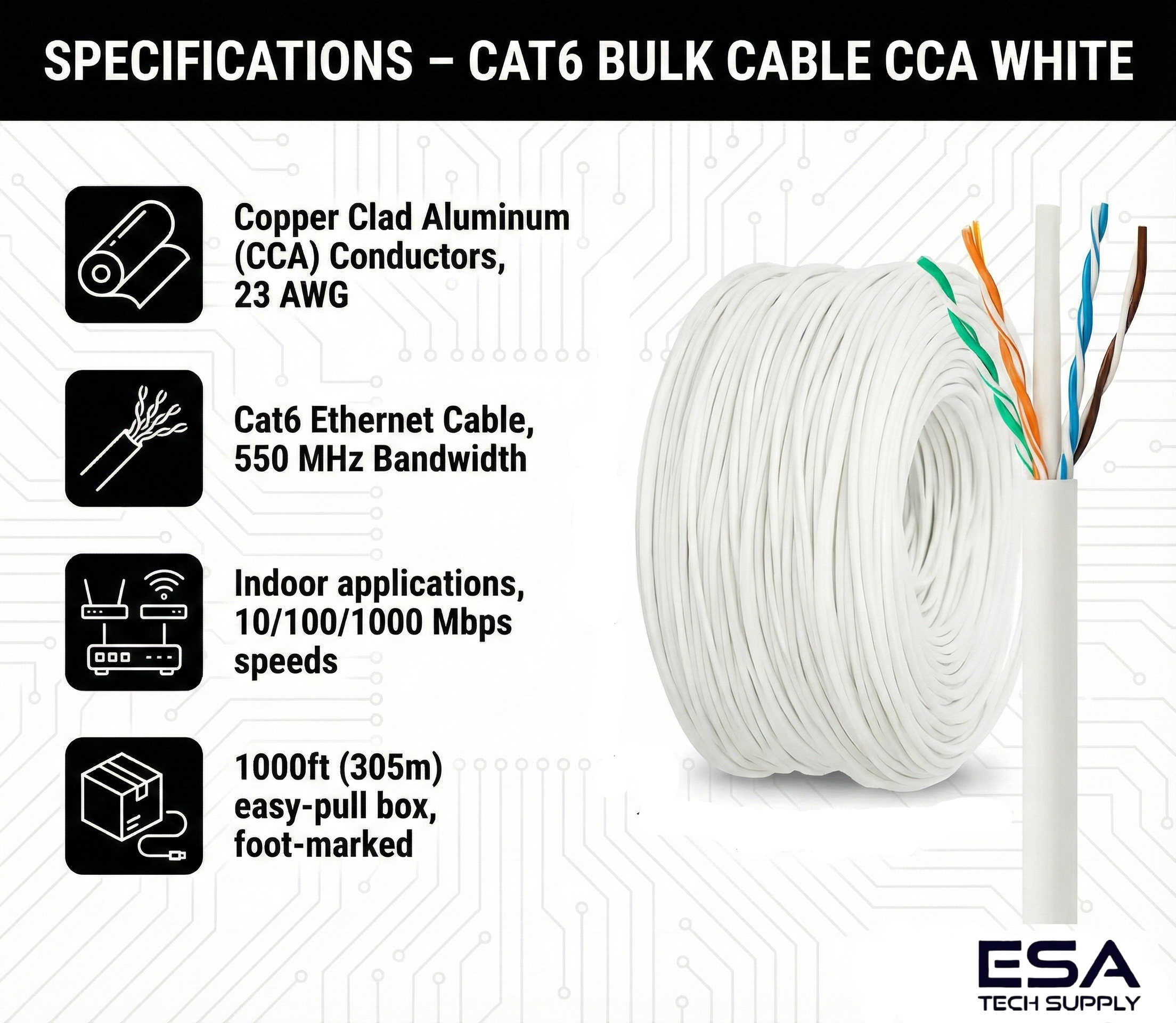 COPPER CLAD ALUMINUM (CCA) CONDUCTORS: Engineered with cost-effective CCA conductors for efficient performance. Note: This cable is not UL, ETL, NEC, or TIA certified and is not recommended for Power Over Ethernet (PoE) applications – Always test the cable for specific use cases before installation