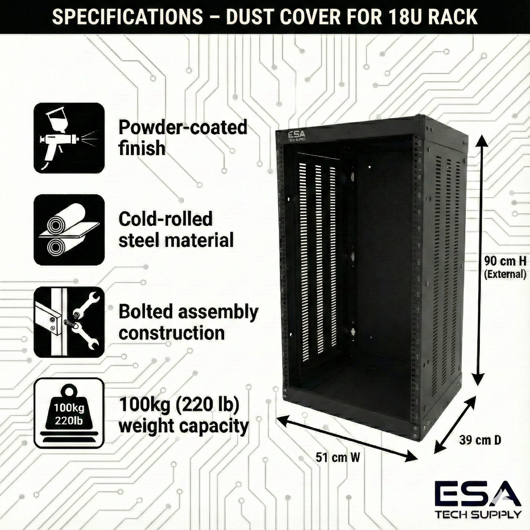This Dust Cover is designed to protect 18U server, network, or audio racks from dust, dirt, and other environmental contaminants. Made from durable, lightweight materials, it helps maintain the cleanliness and longevity of equipment installed in the rack. The cover is easy to install and remove, providing convenient access while keeping the interior protected when the rack is not in use.