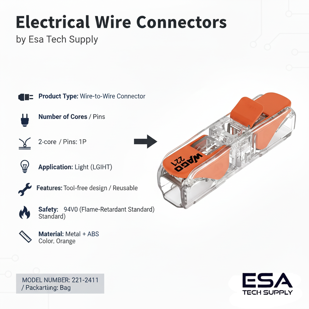 The 221-2411 Wire-to-Wire Connector is a compact and efficient electrical connector designed for fast, safe, and reliable wire terminations. Made from durable metal and ABS materials, it ensures strong conductivity and long-lasting insulation protection.