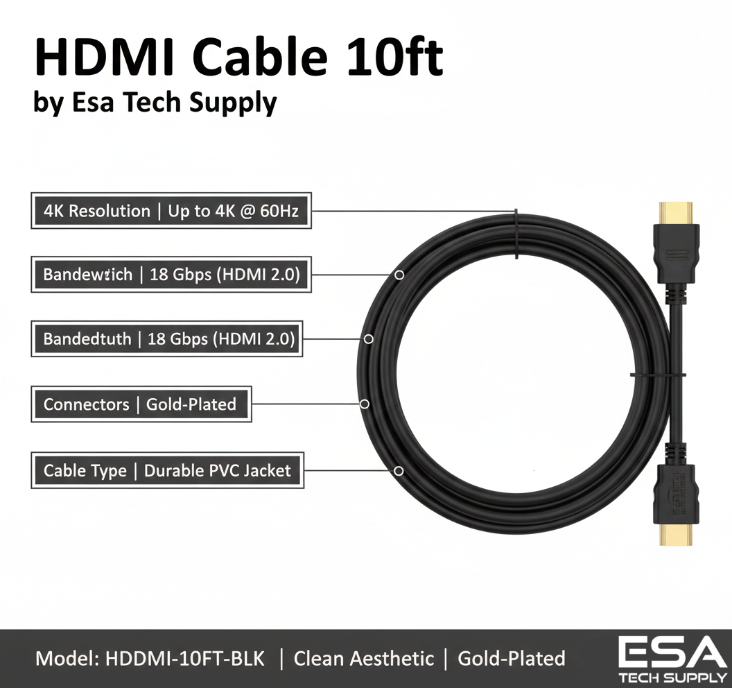 This 10-foot HDMI cable is designed to deliver high-quality digital video and audio between your devices. It supports 4K Ultra HD resolution, HDR, and high-speed data transmission for crystal-clear picture and sound. Ideal for connecting TVs, monitors, projectors, gaming consoles, and home theater systems over long distances without signal loss.