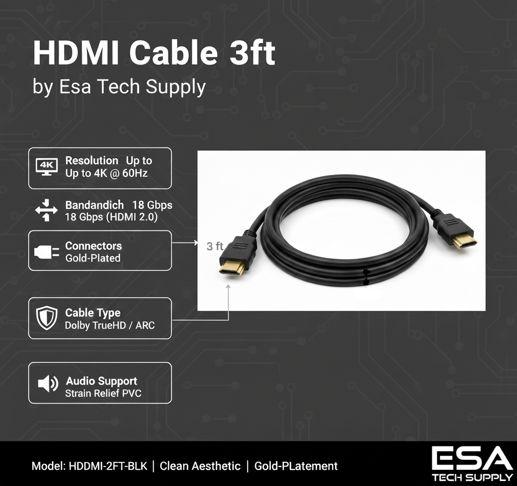 This 3-foot HDMI cable is designed to deliver high-quality digital video and audio between your devices. It supports 4K Ultra HD resolution, HDR, and high-speed data transmission for crystal-clear picture and sound. Ideal for connecting TVs, monitors, projectors, gaming consoles, and home theater systems over long distances without signal loss.