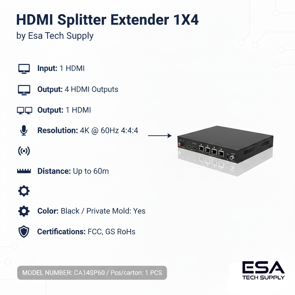 The HDMI 2.0b 1×4 Splitter allows a single HDMI source to be split and output to 4 HDMI displays simultaneously, maintaining high-quality video and audio transmission over long distances. Supporting a resolution of 4K at 60Hz 4:4:4, this splitter ensures excellent image clarity and color accuracy, ideal for use with 4K UHD TVs, monitors, and projectors.