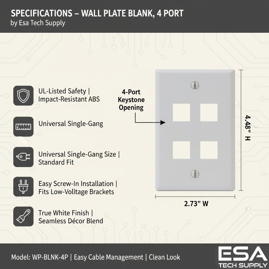 The ESA 4-Port Wall Plate Blank is a versatile faceplate designed to accommodate up to four keystone jacks. It provides a neat, professional finish for network, voice, and AV installations, making it ideal for home theaters, office conference rooms, or commercial cabling setups.