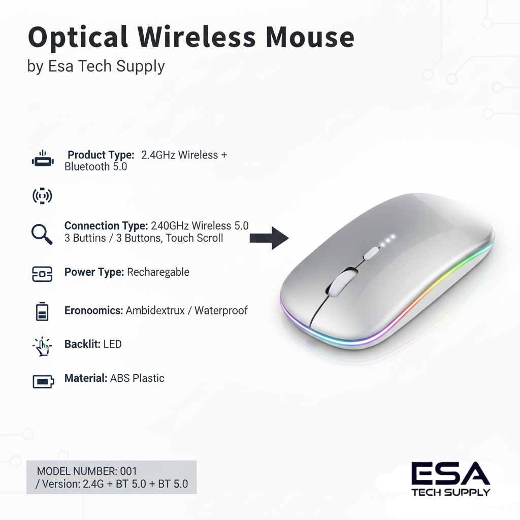 The 001 Wireless Optical Mouse combines performance, portability, and comfort in one compact design. Featuring dual-mode connectivity (2.4GHz wireless and Bluetooth 5.0), it seamlessly pairs with desktops, laptops, and tablets. With a 2400 DPI optical sensor, it delivers precise and responsive tracking, ideal for both office work and casual gaming.